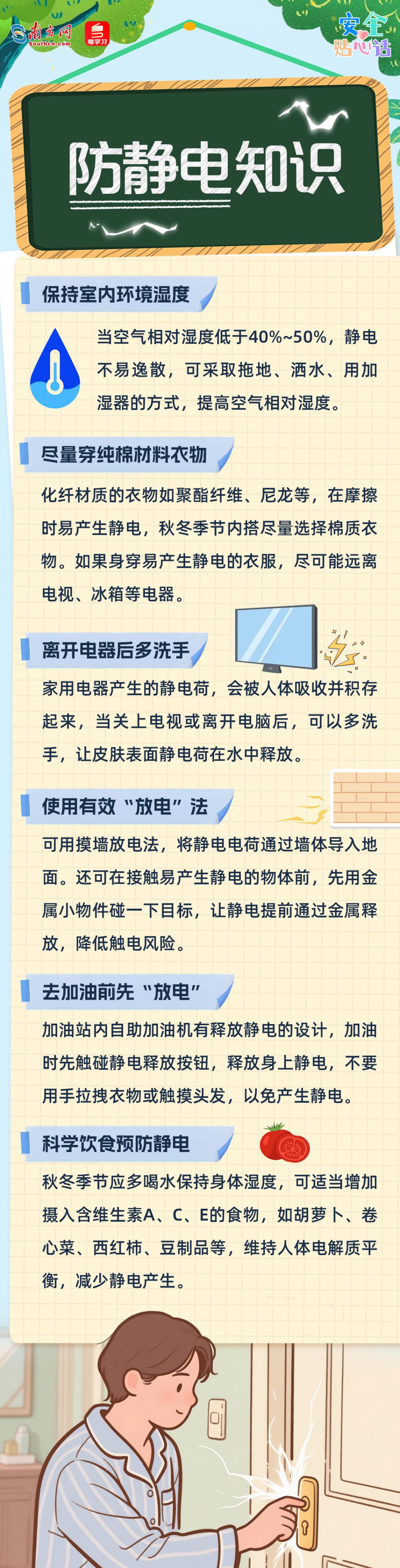 天干物燥的秋冬季节很容易产生静电,别看静电能量不大,一旦接触易燃易爆物质,就可能引发火灾。因此,我们还需警惕静电 " 惹火 "。
