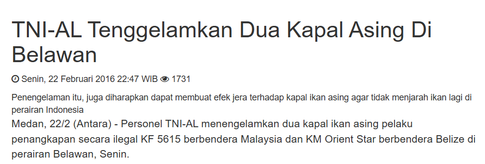 2016年2月22日,安塔拉通讯社早先报道有30艘船在印尼5个海域被击沉,后又补充在勿拉湾还有一艘伯利兹的渔船被击沉。