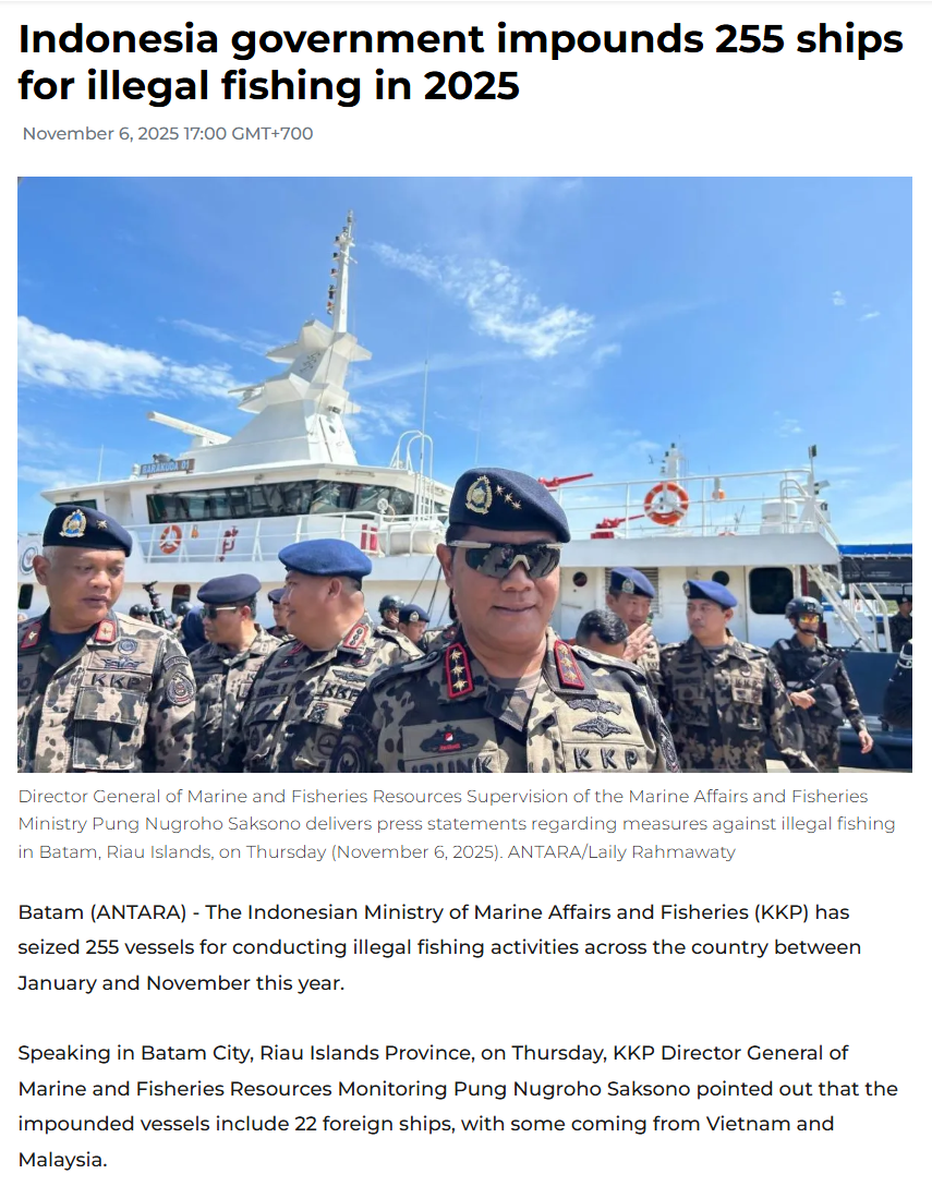 与此同时,近年来印尼官方扣押的外国船只的数量也有明显下降。印尼海洋事务与渔业部公布的数据显示,在2024年,印尼在全国海域一共扣押了240艘渔船,其中30艘为外国船只。今年1月至11月初,印尼海洋事务与渔业部共查扣了255艘渔船,其中22艘为外国船只。