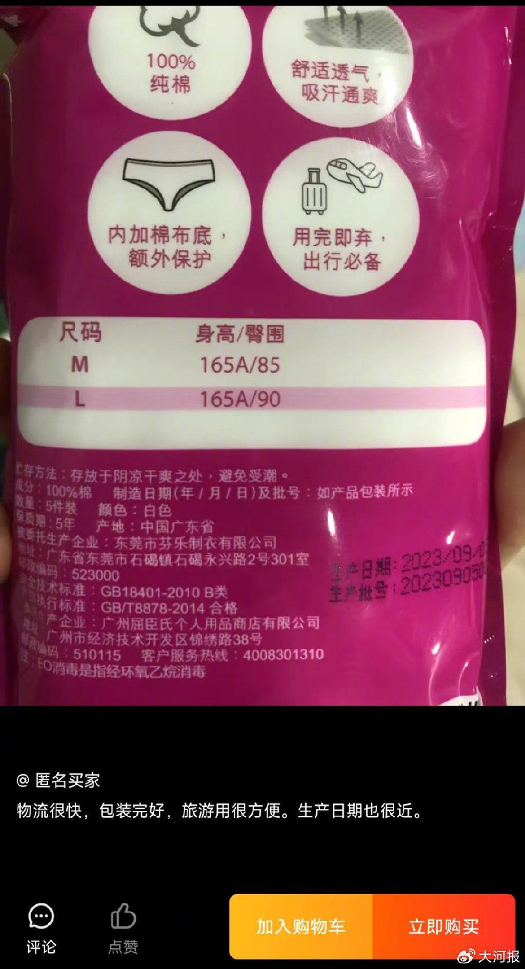 此外,在商品评价区,网友晒出的 " 屈臣氏舒适免洗棉内裤一次性内裤 " 包装显示,该产品的生产企业为东莞市芬乐制衣有限公司。
