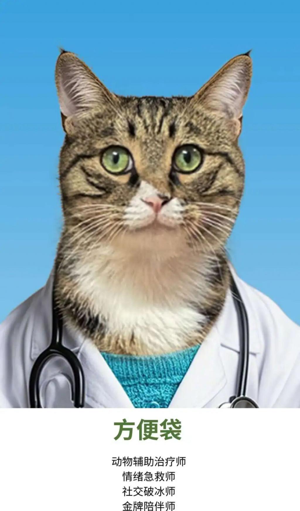 在济南智善心理医院(下称 " 智善心理 ")," 医疗专家团 " 介绍栏的首位是一张穿着白大褂的狸花猫照片。这只名为 " 方便袋 " 的猫,被称作 " 方医生 ",头衔是动物辅助治疗师、情绪急救师、社交破冰师和金牌陪伴师。院长、资深咨询师的介绍排在其后。