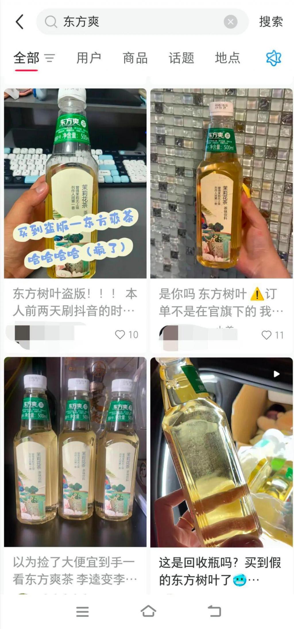 " 在社交平台刷到这个产品时,我以为是东方树叶,价格还便宜,结果买来发现根本不是。" 一位消费者在社交平台发文吐槽,称自己买到了与农夫山泉旗下无糖茶品牌东方树叶高度相似的 " 东方爽茶 "。