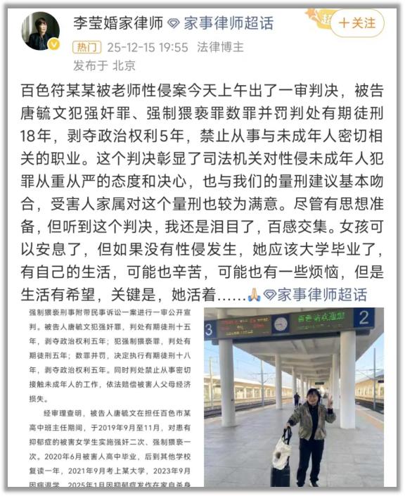 而一切的始作俑者,显然就是那个利用教师身份靠近她、围猎她、侵犯她的唐某人。