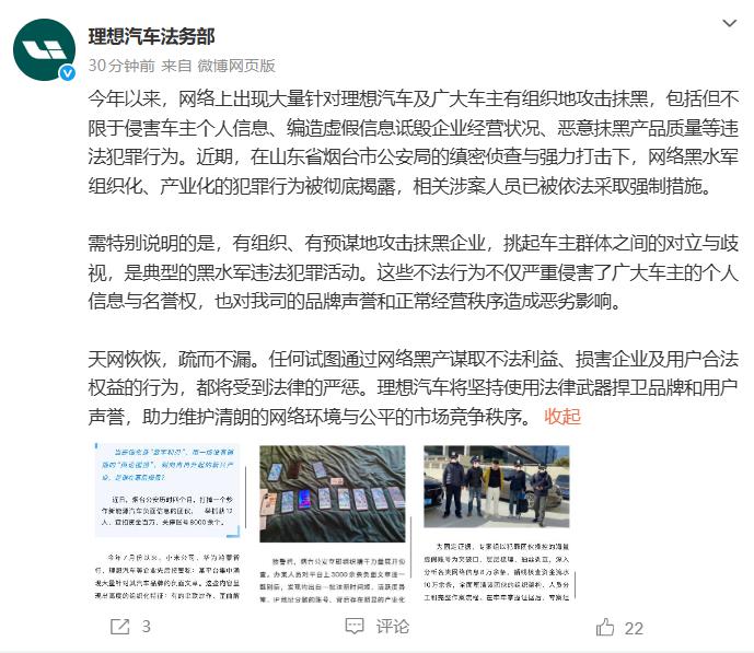 今年以来,网络上出现大量针对理想汽车及广大车主有组织地攻击抹黑,包括但不限于侵害车主个人信息、编造虚假信息诋毁企业经营状况、恶意抹黑产品质量等违法犯罪行为。近期,在山东省烟台市公安局的缜密侦查与强力打击下,网络黑水军组织化、产业化的犯罪行为被彻底揭露,相关涉案人员已被依法采取强制措施。