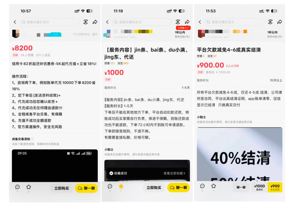 在闲鱼平台,时代周报记者以 " 债务减免 "" 还卡优惠 "" 还款优惠券 " 等关键词搜索,发现大量提供相关服务的商品链接。有商家明确标注:" 所有平台欠款减免 4-6 成,仅还 4-5 成结清,公司律所签合同,平台出具结清证明,app 账单清零,征信显示已结清,只做真实交付。"
