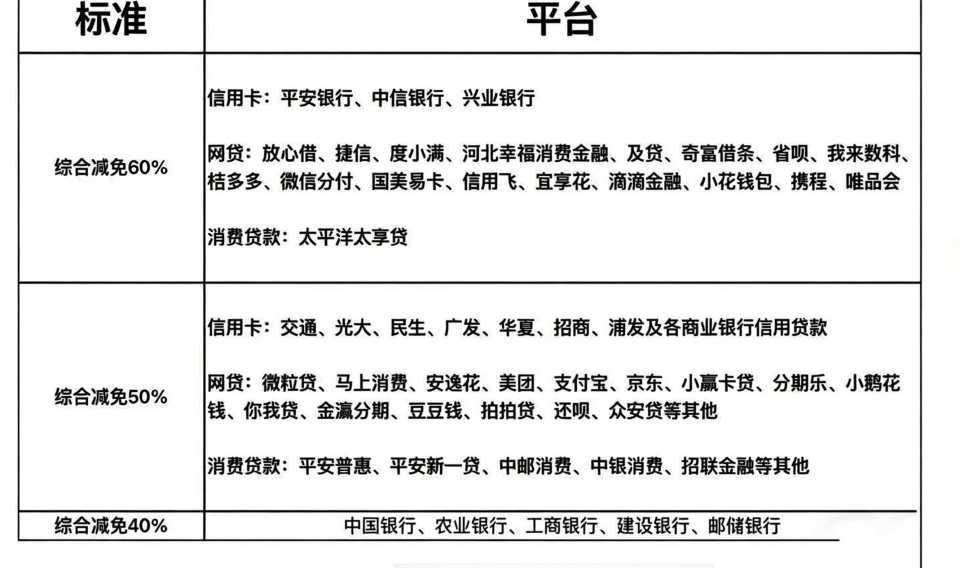 该商家发来的价目表显示,各类债务均可高额减免:中行、农行、工行、建行、邮储银行等五大国有银行信用卡可综合减免 40%;多数股份制银行及主流网贷平台(如微粒贷、支付宝、美团、京东等)可减免 50%;部分银行及网贷平台甚至可减免 60%(如度小满、携程等)。