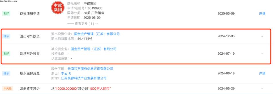 天眼查显示,中律集团曾于 2024 年 7 月 19 日新增对外投资,投资标的为国金资产;2024 年 12 月 3 日,退出投资,退出前持股比例 44.44%。