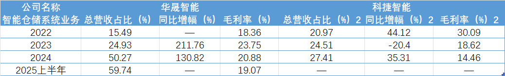 华晟智能的另一核心业务智能仓储物流系统业绩占比不断提升,由2022年的15.49%增长至今年上半年的59.74%,但该业务毛利率却呈现波动下滑态势,报告期内分别为18.36%、23.75%、20.88%、19.07%。