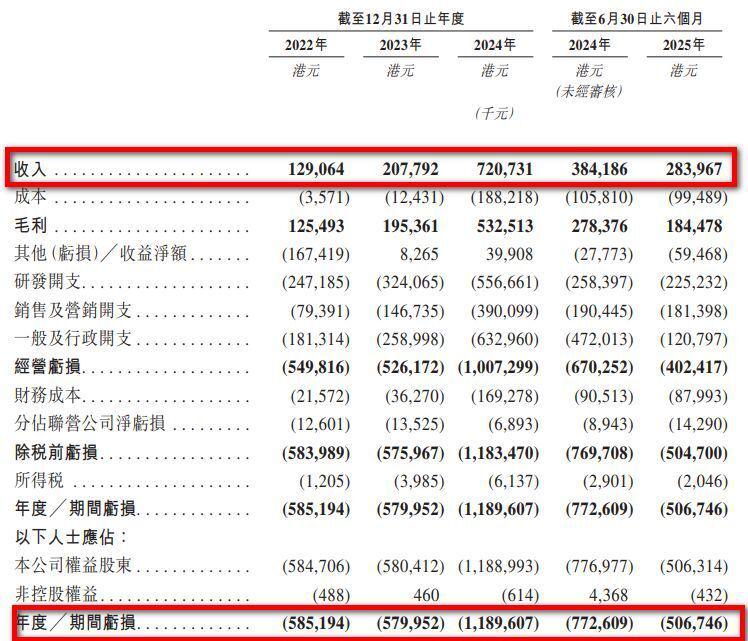 招股书显示,HashKey 在 2022 年、2023 年及 2024 年的收入分别为 1.29 亿港元、2.08 亿港元及 7.21 亿港元,两年收入累计增长超 458%,年复合增速超 130%。同期,公司亏损分别为 5.85 亿港元、5.80 亿港元和 11.90 亿港元,三年累计亏损超 23 亿港元。2025 年上半年,公司收入同比下降 26.1% 至 2.84 亿港元,亏损 5.07 亿港元。