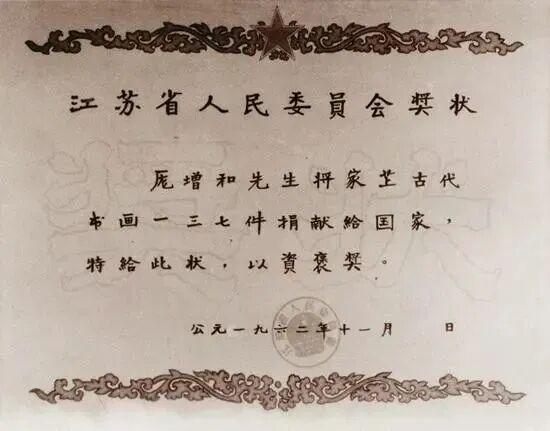 1962 年 11 月,江苏省人民委员会颁发给庞家后人捐赠古代书画 137 件的奖状 / 图源:央视网