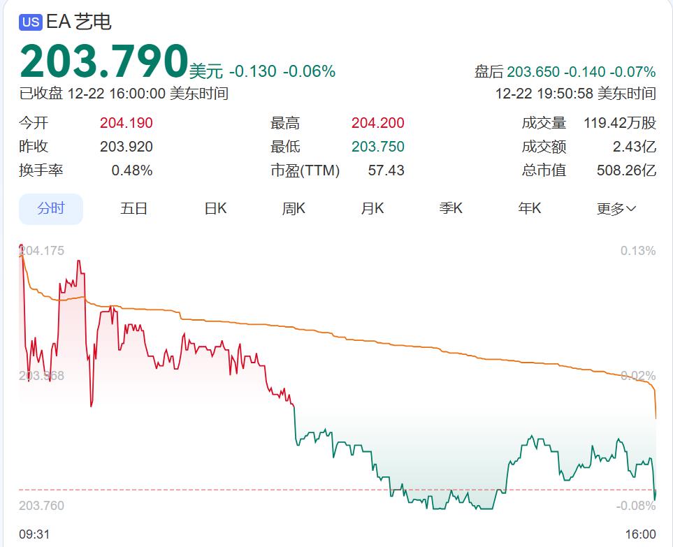 截至当地时间 22 日收盘,EA 股价报 203.79 美元,总市值 508.26 亿美元。