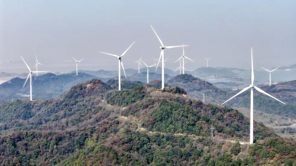 12 月 3 日,在江西九江市湖口县舜德乡高桥村,风力发电机组矗立青山间,不断输送绿色清洁能源。张玉摄