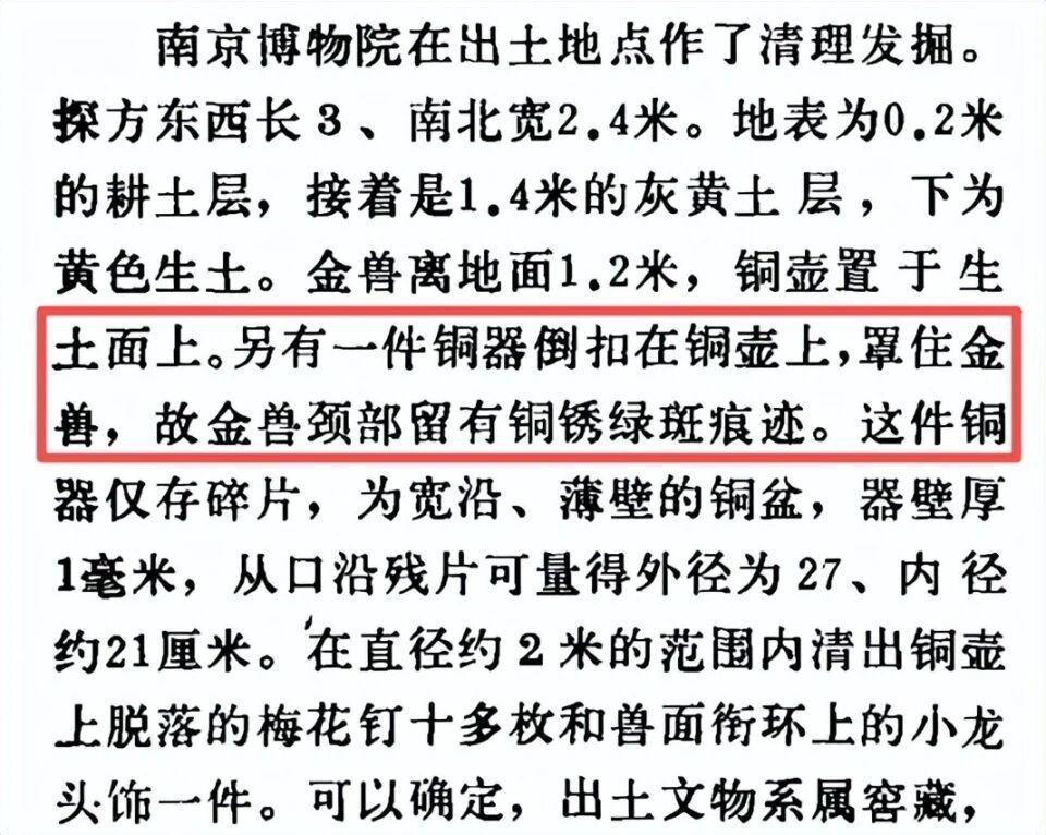根据《文物》期刊 1982 年第 11 期,南京博物院原院长姚迁在《江苏盱眙南窑庄楚汉文物窖藏》一文中提及,出土时,金兽盖在铜壶上,金币贮于铜壶内,取下金兽时,有几块马蹄金还嵌在金兽底部的凹陷处,壶内有少量水汽,没有泥土和积水。金兽离地面 1.2 米,铜壶置于生土面上。另有一件铜器倒扣在铜壶上,罩住金兽,故金兽颈部留有铜锈绿斑痕迹。