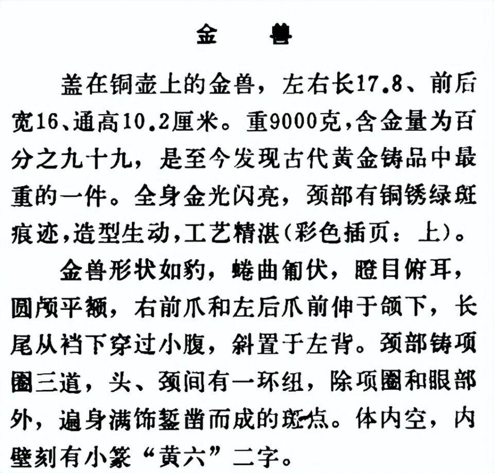 文章在详细介绍 " 金兽 " 时亦提及,全身金光闪亮,颈部有铜锈绿斑痕迹,造型生动,工艺精湛。
