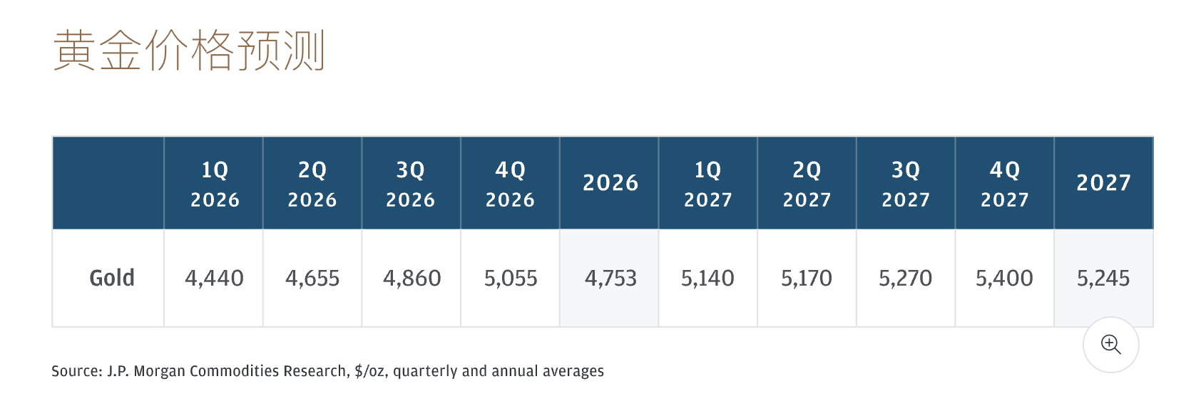 摩根大通的预测更为乐观,到2026年四季度,金价平均将达到每盎司5055美元,到2027年底将上涨至每盎司5400美元。
