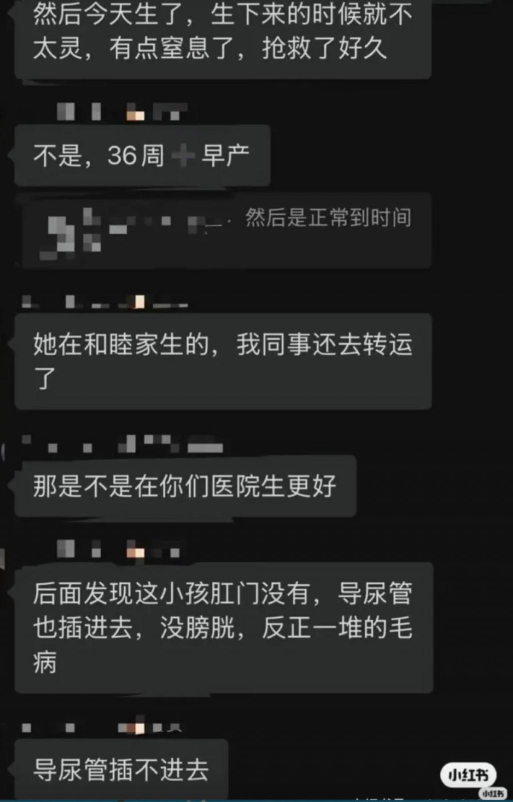12 月 23 日深夜,多份疑似医护人员的群聊记录称:阚清子 36 周早产生女,新生儿因 " 无膀胱、无肛门等先天畸形 " 抢救无效夭折,并提及 " 羊穿已知异常仍坚持生产 " 等细节。