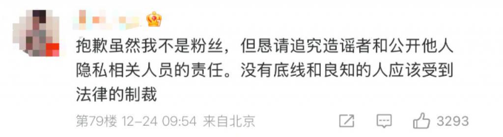 " 抱歉虽然我不是粉丝,但恳请追究造谣者和公开他人隐私相关人员的责任。没有底线和良知的人应该受到法律的制裁。"