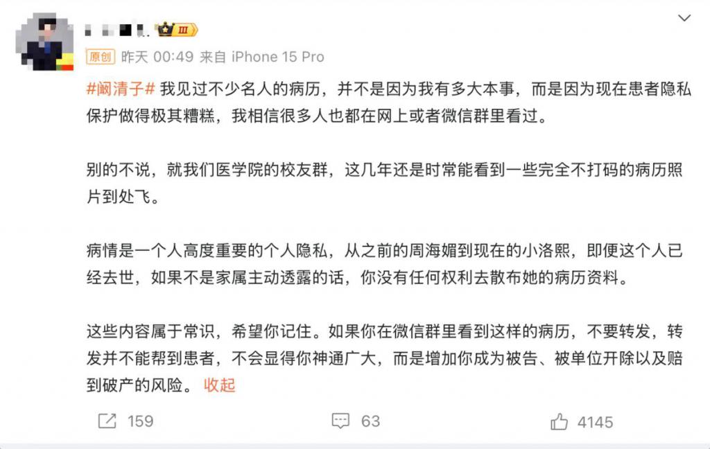 一位医疗领域博主则从专业角度发出警示:" 如果你在微信群里看到这样的病历,不要转发——转发并不能帮到患者,而是增加你成为被告、被单位开除以及赔到破产的风险。" 该条微博获得了超过 4000 次转发,相关内容在医疗从业者中引发广泛讨论。