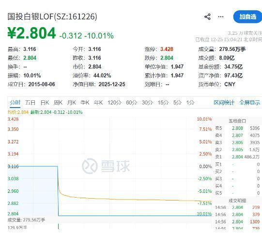 另外,国投白银 LOF 发布公告称,将于26 日开盘起至 10:30 停牌后复牌,并警示二级市场交易价格存在明显溢价风险。截至 12 月 25 日,该基金二级市场收盘价为 2.804 元,较 12 月 24 日的基金份额单位净值 1.9278 元高出 45%。