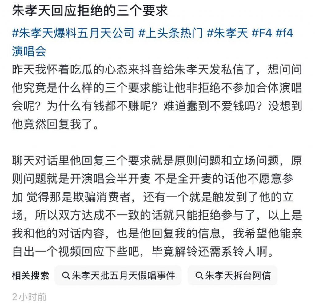 12 月 24 日,有网友发帖称,通过私信联系到朱孝天本人核实相关情况,意外获得其回复后以 " 朱孝天回应拒绝的三个要求 " 为题发文,并表示:" 没想到他竟然回复我了 "。