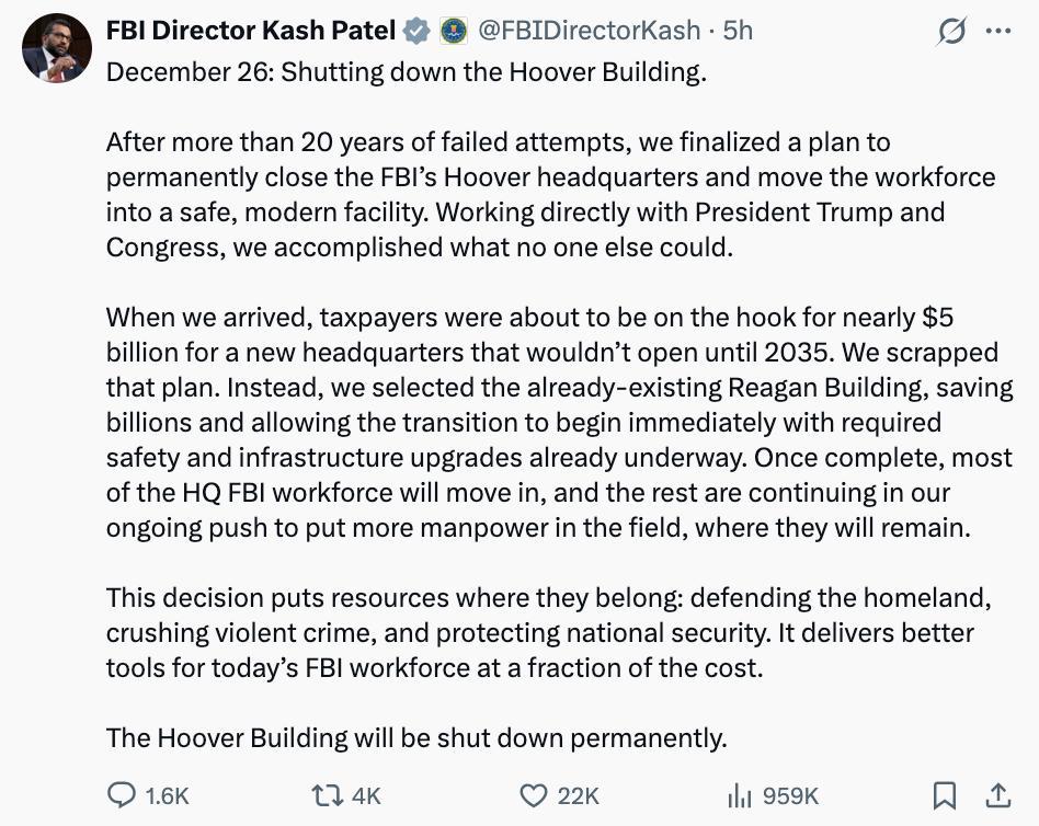 当地时间 12 月 26 日,美国联邦调查局(FBI)局长卡什 · 帕特尔宣布,作为 FBI 的办公大楼,长期象征着美国国内安全核心力量的约翰 · 埃德加 · 胡佛大楼将被" 永久关闭 "。帕特尔在社交媒体上写道,这座 " 象征历史但早已不合时代的建筑 " 将被彻底腾空,FBI 总部职能将迁入此前美国国际开发署(USAID)所在的罗纳德 · 里根大厦。