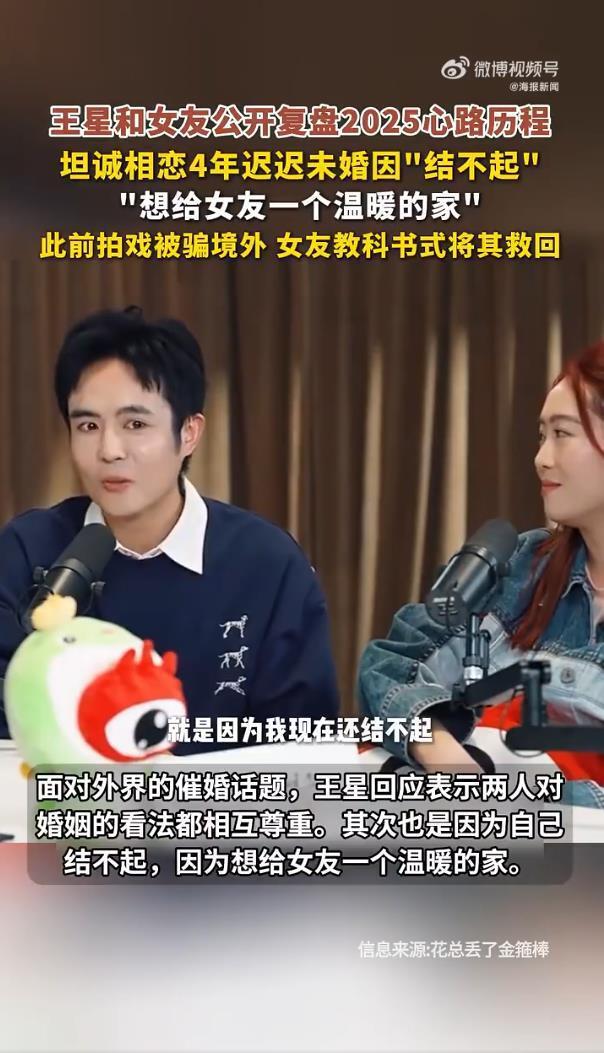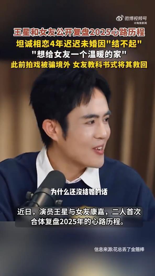 据 12 月 28 日报道,最近,演员王星和女友康嘉首次合体复盘 2025 年,一句 " 结不起 " 直接让两人的婚恋状态冲上热搜。面对外界对 " 恋爱长跑四年为何不结婚 " 的连环追问,王星的回答戳中了不少人的现实痛点——不是不想,是经济上 " 结不起 ",责任上 " 不敢结 "。