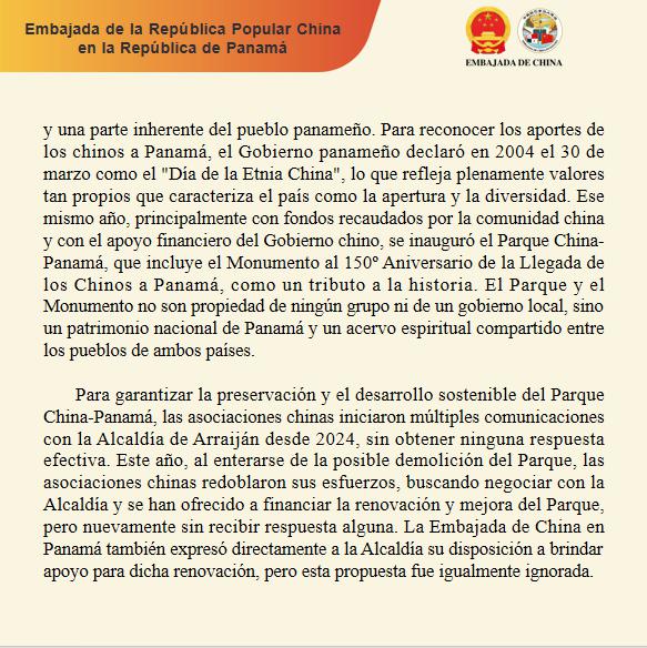 12 月 27 日深夜,阿赖汉市政府在未作任何事前通知、也未事先与华人社团进行任何沟通的情况下,不顾现场华侨华人代表的一致反对,悍然强行拆除了位于美洲大桥观景台的、铭记华人对巴百年贡献和象征中巴人民友谊的中巴公园及华人抵巴 150 周年纪念碑。此举不仅粗暴践踏了巴拿马 30 万华侨华人同胞的集体感情,也严重伤害了中国人民对巴拿马人民的友好情谊。中国驻巴拿马大使馆对此表示极度震惊、强烈愤慨和坚决反对。