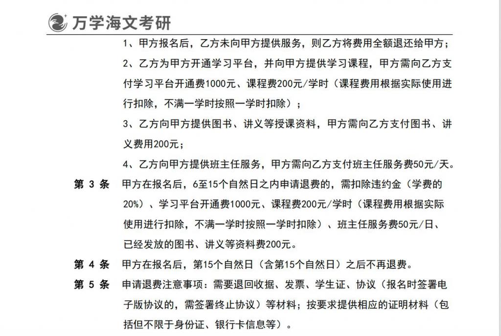 金同学和万学海文教育签订的合同显示," 第 15 个自然日之后不再退费 "。受访者供图