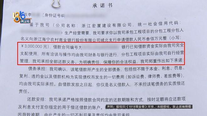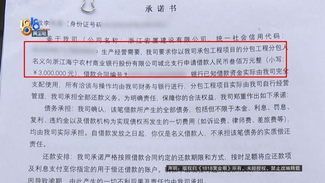 让老板签下了承诺书,说是 " 鉴于公司生产经营需要,公司要求李先生以分包工程分包人名义,向浙江海宁农村商业银行股份有限公司城北支行申请借款人民币 300 万元。