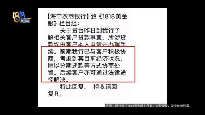 海宁农商银行方面回复,所涉贷款均由客户本人申请并办理手续,前期已与客户积极协商,考虑到其目前经济状况,愿以分期还款等方式协商处置,客户也可以通过法律途径解决。