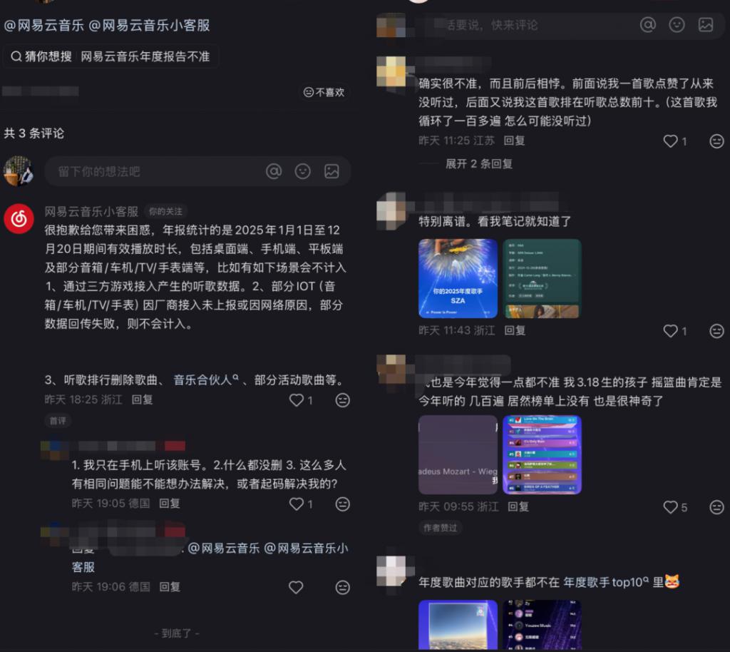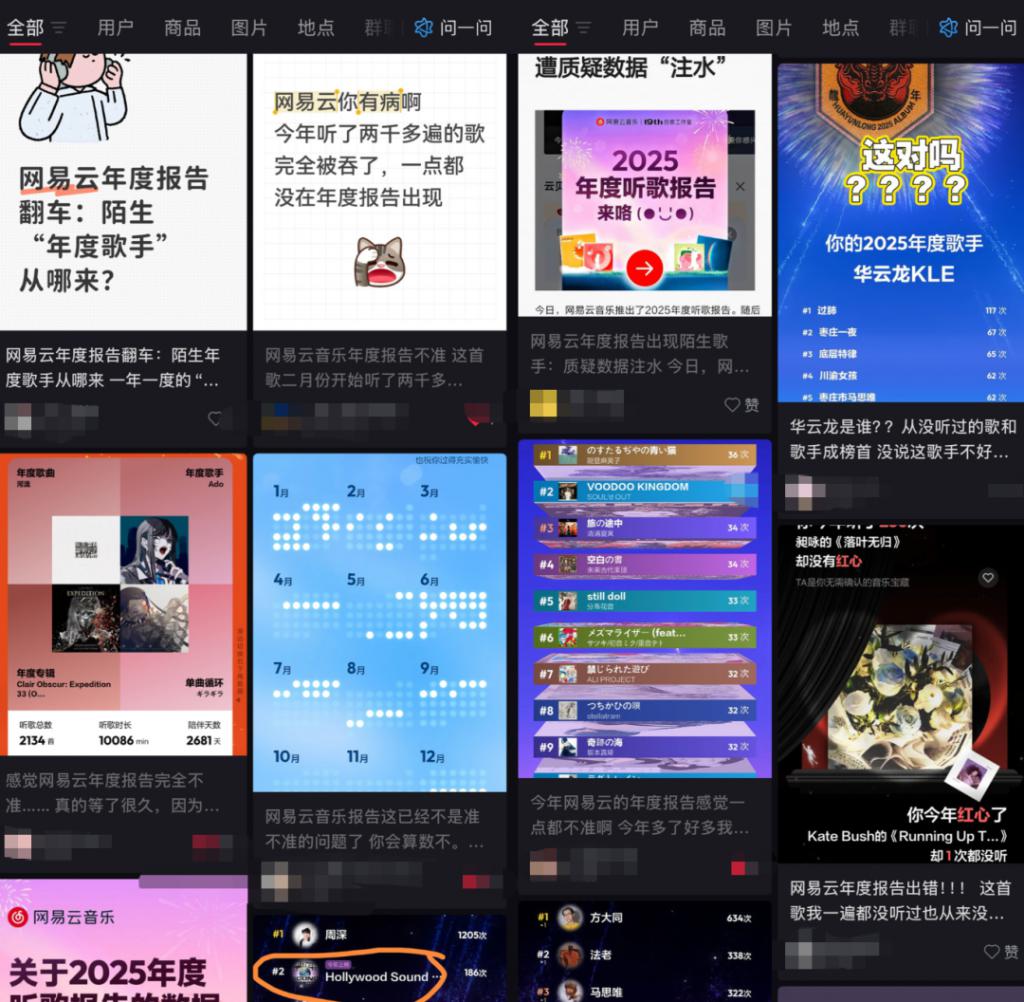 这类声音在社交平台上频频出现。不少用户因此对网易云音乐年度报告的统计规则提出质疑,认为其未能真实反映个人年度听歌行为,部分结果甚至与自身音乐偏好 " 严重脱节 "。