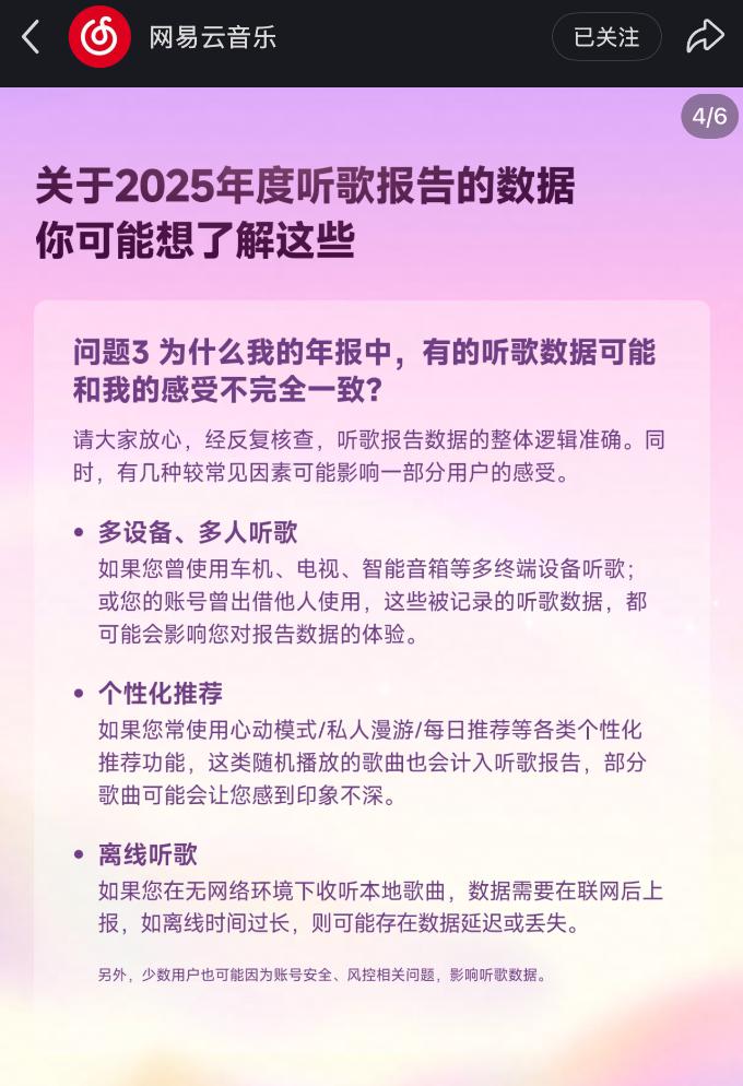 经反复核查,听歌报告数据的整体逻辑准确。同时,有几种较常见因素可能影响一部分用户的感受。