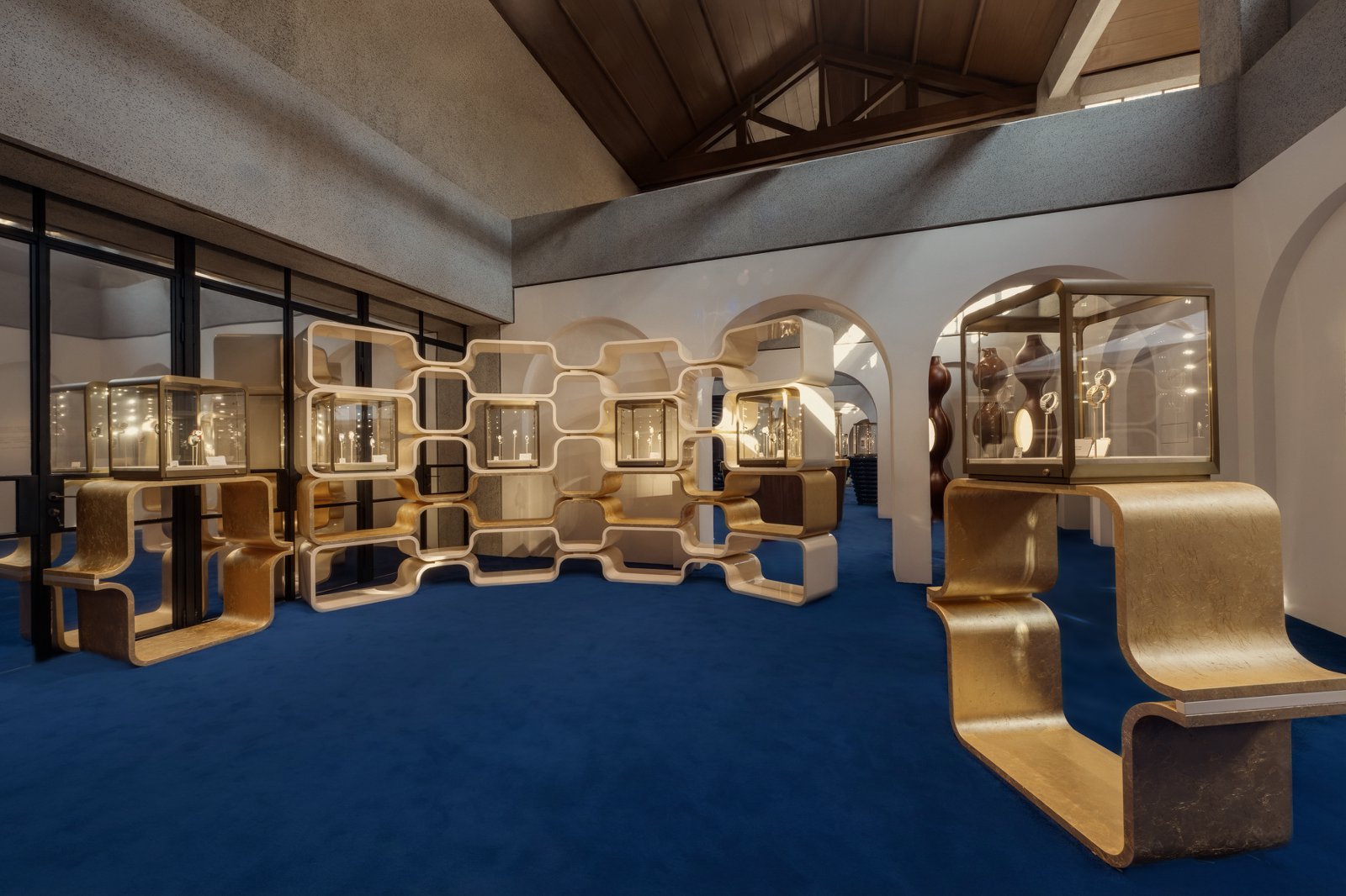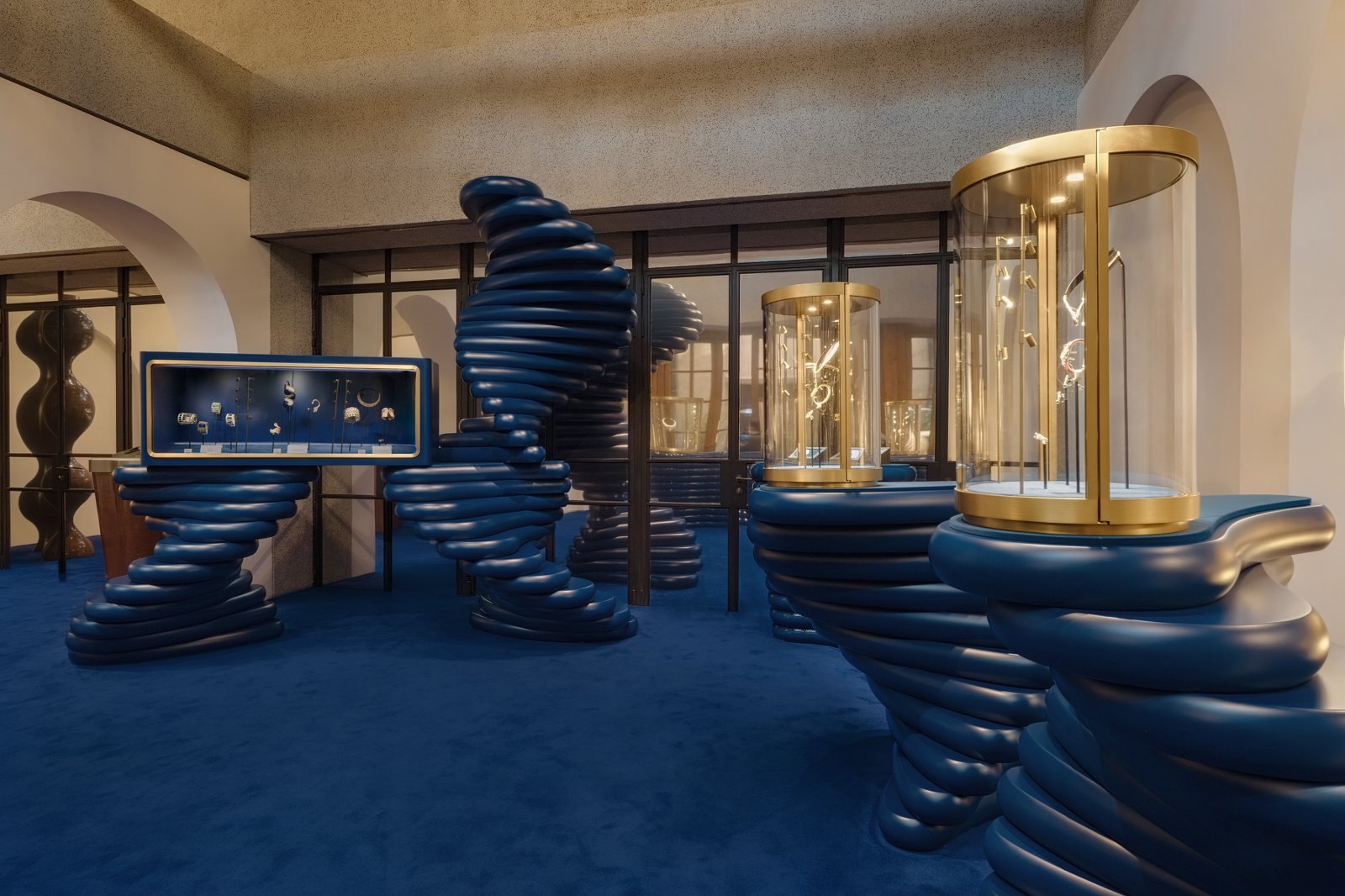该空间内布置有蓝色的旋转装置,其设计灵感源自法国的塞特小镇层级而上的自然风光,又向1980年代Claude Montana推出的经典香水瓶身造型致敬。这个空间营造出一种私密而奢华的名流雅聚氛围,凝聚了伯爵多年来凝聚全球创意精英与品味名流的独特生态。