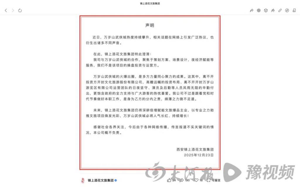 面对舆论风波,锦上添花文旅集团于 2025 年 12 月 23 日通过官方渠道发布声明,澄清其角色:" 我司与万岁山武侠城的合作,聚焦于策划方案、场景设计与夜经济赋能等服务,并非该项目的操盘投资与运营方。"