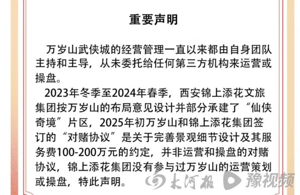 直至 2026 年 1 月 1 日,随着万岁山武侠城官方声明的发布,事件才得以彻底澄清。声明明确指出:" 与锦上添花集团签订的‘对赌协议’,仅限于完善‘仙侠奇境’片区景观细节设计及相关服务费的约定,金额仅为 100 – 200 万元。" 官方借此重申:景区整体运营与操盘始终由自身团队主导,锦上添花集团从未参与万岁山的运营策划或实际操盘。