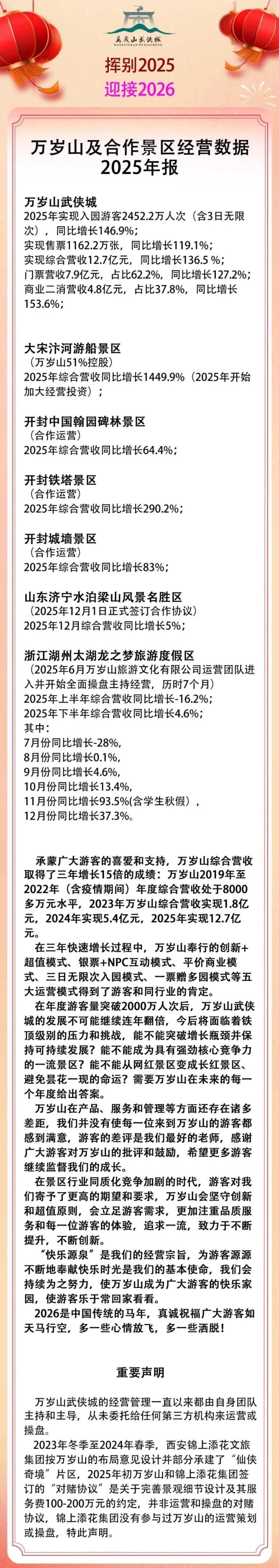 2026 年 1 月 1 日,该景区正式披露 2025 年报:全年综合营收 12.7 亿元,同比增长 136.5%;入园游客超 2452.2 万人次(含 3 日无限次),同比增长 146.9%。