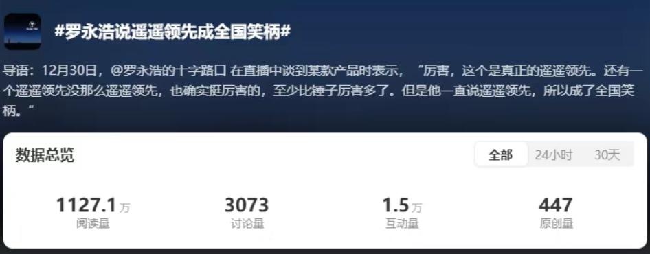 那这 " 遥遥领先 " 梗又是咋回事呢?原来,罗永浩在介绍一款 3D 打印机时,他先夸这款产品 " 这才叫真 · 遥遥领先 "。接着来了句:还有个老说自己遥遥领先的,其实没那么领先,不过确实比锤子厉害多了。就因为天天把这四个字挂嘴边,现在都成全国笑柄了。