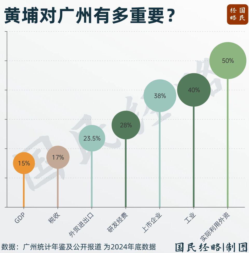目前,黄埔以占 6.5% 的面积,扛起了全市约 15% 的 GDP、17% 的税收、40% 的工业产值和 50% 的实际利用外资,研发强度跻身世界一流水平,工业产值逼近万亿大关。