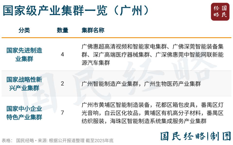 立足于广东,截至 2025 年底,广东累计培育 8 个国家级先进制造业集群、6 个战略性新兴产业集群,广州分别占据 4 席、2 席,无一例外都以黄埔为核心承载地。