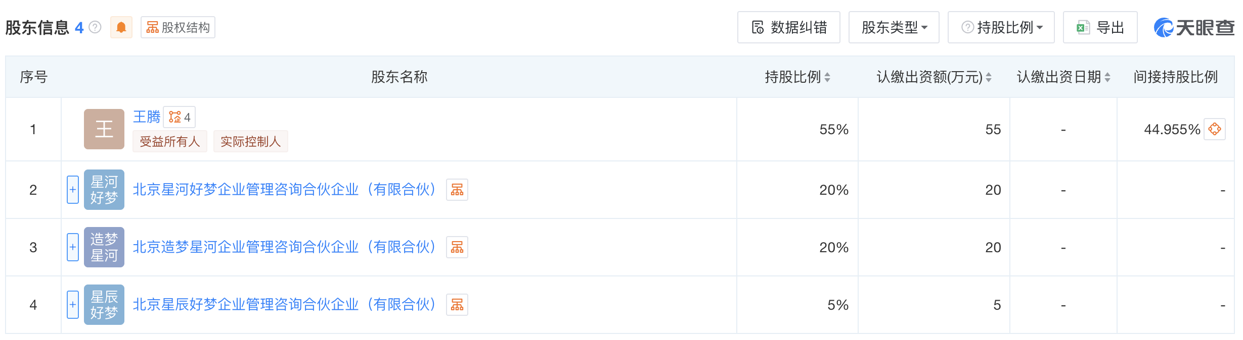 目前王腾是该公司实际控制人,持股比例为55%,其他股东还包括北京星河好梦企业管理咨询合伙企业(有限合伙)、北京造梦星河企业管理咨询合伙企业(有限合伙)、北京星辰好梦企业管理咨询合伙企业(有限合伙)。但星河好梦、造梦星河、星辰好梦这三家公司的实际控制人同样为王腾。