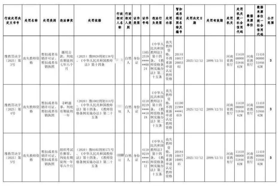 河南省教育厅于 2025 年 12 月 31 日正式发布《2025 年撤销高校教师资格行政处罚》通告,依法对省内五名高校教师作出丧失或撤销教师资格的处理。