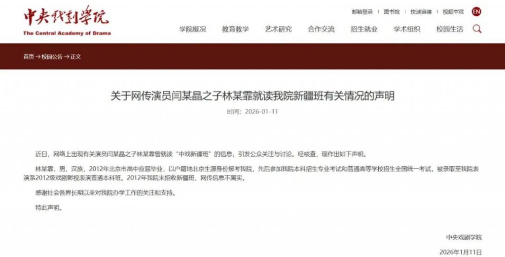 1 月 11 日晚,中央戏剧学院对此发布声明回应:林某霏,男,汉族,2012 年北京市高中应届毕业,以户籍地北京生源身份报考我院,先后参加我院本科招生专业考试和普通高等学校招生全国统一考试,被录取至我院表演系 2012 级戏剧影视表演普通本科班。2012 年我院未招收新疆班,网传信息不属实。