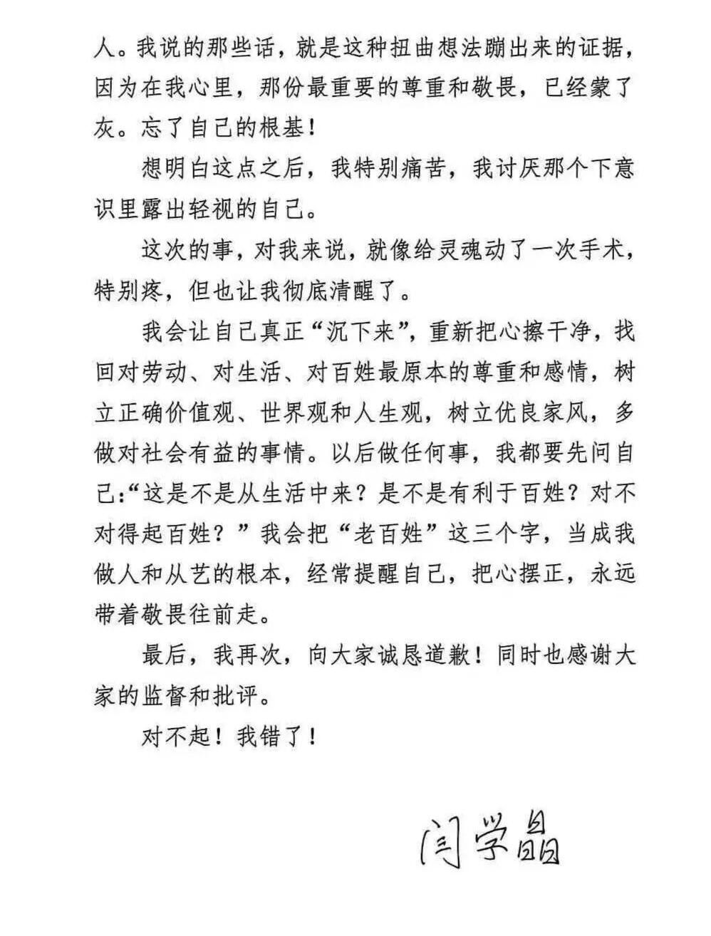 1 月 11 日晚,闫学晶在朋友圈发文致歉: