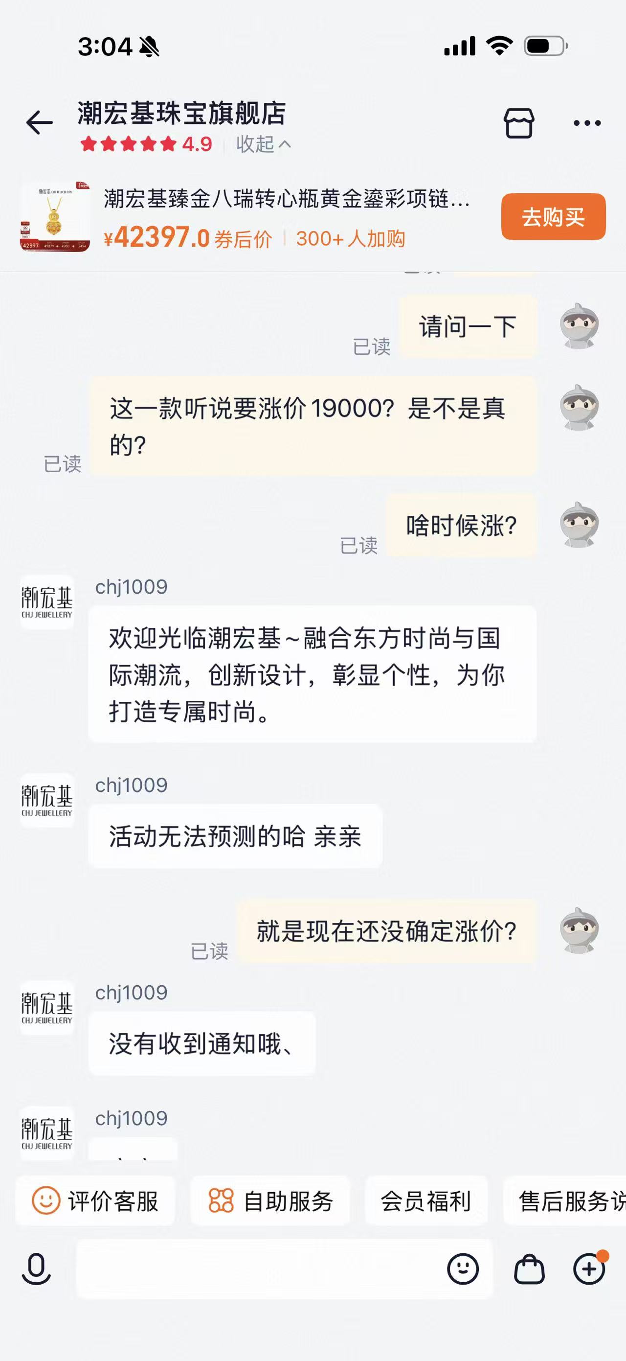 1月12日,界面新闻向潮宏基天猫旗舰店客服咨询,爆款“转心瓶”项链是否将调价?客服回应称:“活动无法预测,目前还未接到调价通知”。天猫店显示,这款项链优惠前原价49879元,参加官方立减5%的活动后,售价42397元,将比原价优惠2494元。