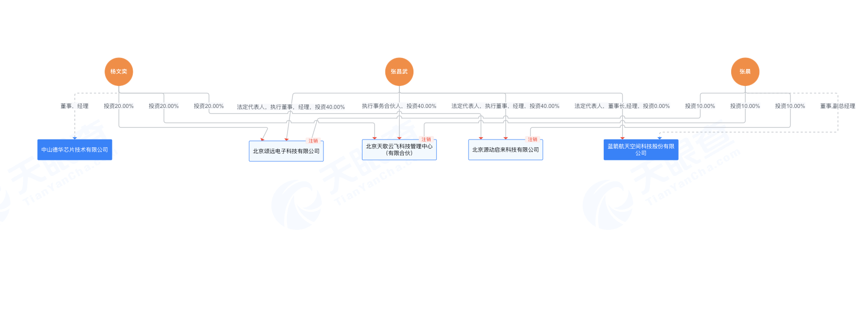 据界面新闻查询天眼查APP,德华芯片董事之一的杨文奕,曾与蓝箭航天创始人张昌武合作过三次。现任蓝箭航天董事、副总经理的张晨,也与杨文奕合作过三次。此外,杨文奕曾担任蓝箭航天的高管