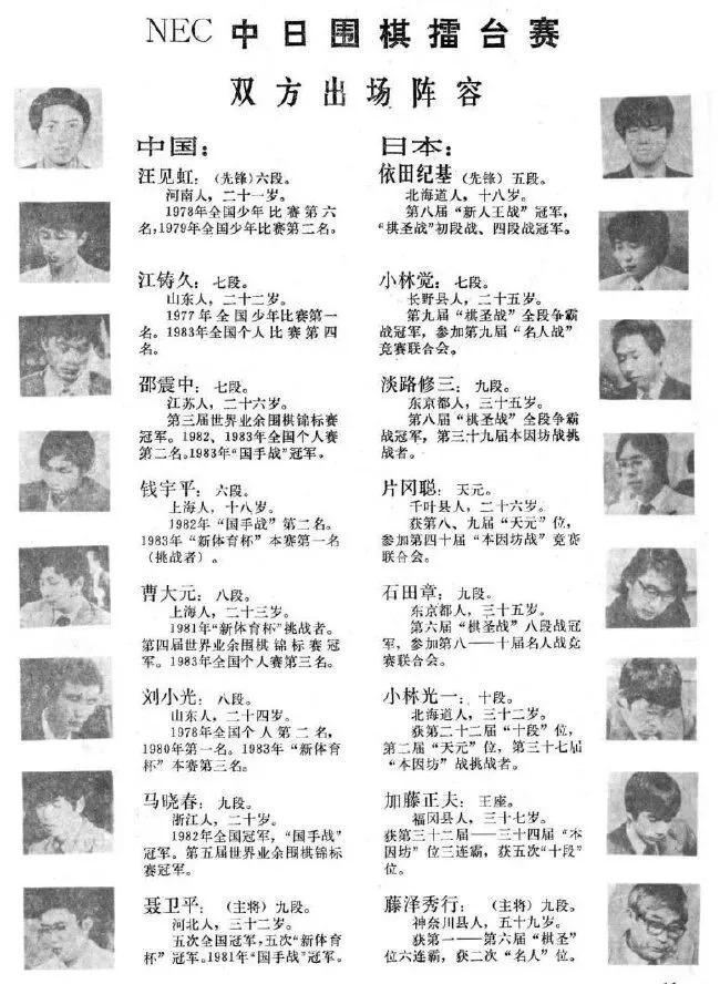 仅一个上午,一项后来影响深远的大赛即告诞生。首届中日围棋擂台赛,双方各出 8 人,中方尽遣精英:汪见虹、江铸久、邵震中、钱宇平、曹大元、刘小光、马晓春、聂卫平。其时 32 岁的聂卫平出任主将。日方派出了依田纪基、小林觉、淡路修三、片冈聪、石田章、小林光一、加藤正夫、藤泽秀行。小林光一和加藤正夫是超一流棋手,藤泽秀行是名誉棋圣,由他压阵更多是象征性的。其他五位棋手均为日本棋界年轻精英。