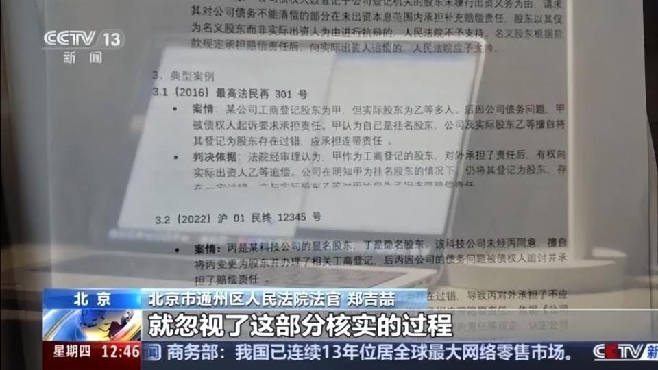 北京市通州区人民法院法官 郑吉喆:特别是当时她援引了上海一中院的 2022 沪 01 民终 12345 号,这是一个民间借贷的案件,这个跟现在原告代理人向我们提交的股权代持是一点关系都没有,可以说叫风马牛不相及。
