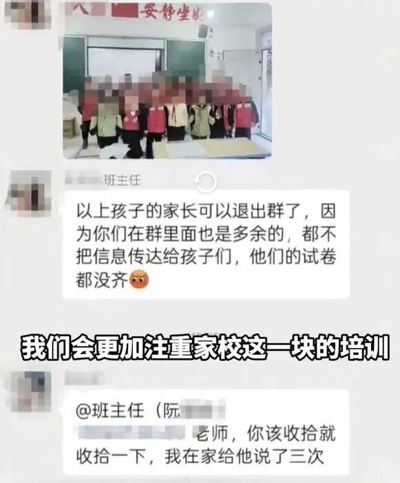 据媒体此前报道,近日,有网友在社交平台发布一张班级微信群聊天截图称,贵州省安顺市紫云自治县第三小学某班主任阮某某,在班级微信群晒出 10 多名未交齐试卷的学生照片。该老师称上述学生家长在群里 " 多余 ",可以退群了,此事引发关注。