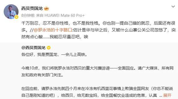 1 月 16 日,贾国龙发文称,今晚 10 点将就罗永浩对西贝的重大污蔑诽谤一一全面回应,请罗永浩先就在冷冻有机西蓝花事情上欺骗全国网友,给西贝,给无数宝妈,给全国餐饮业造成的危害,认真道歉,并赔偿相应损失。