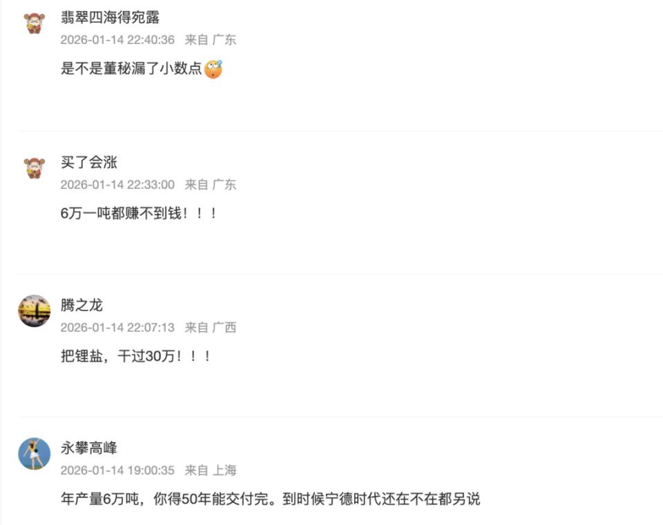 不少投资者也觉得这一订单金额过于离谱。有投资者表示" 是不是董秘漏了小数点?"有投资者质疑," 年产量 6 万吨,你得 50 年能交付完。到时候宁德时代还在不在都另说。"" 这是在搞笑吗?1200 亿合同都能估算得出,这不是 1200 块啊。"还有投资者表示," 炒股这么多年,第一次见这种事。"" 扇贝也没敢跑这么多!!!"